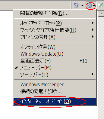 (1)IEの右上に有る歯車のマークをクリックして、[インターネット オプション]を選択します。