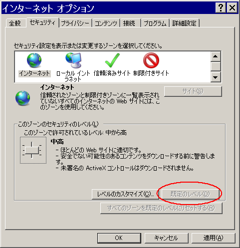 (2)[セキュリティ]タブをクリック。あまり詳しくない方は[規定のレベル]がお勧めです。